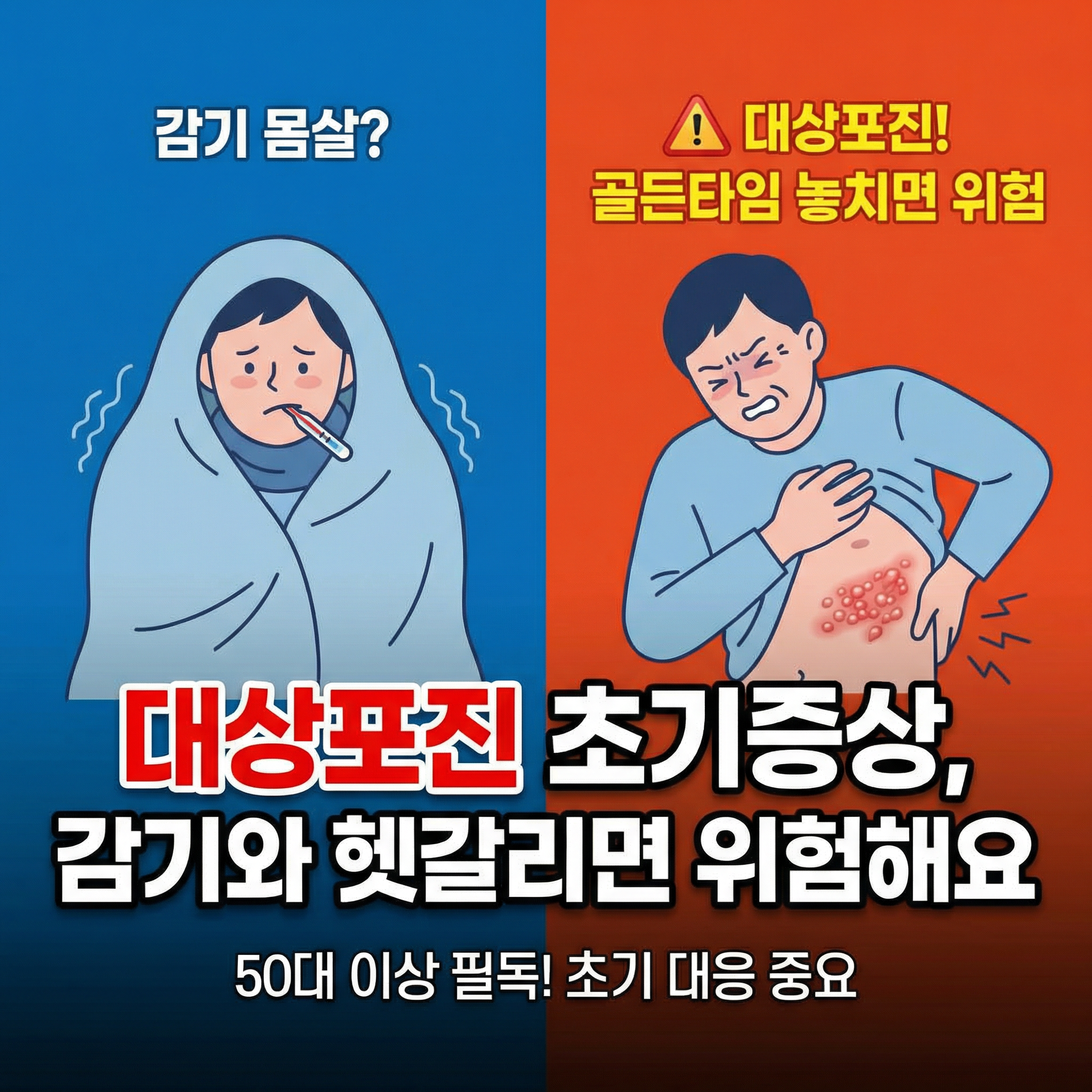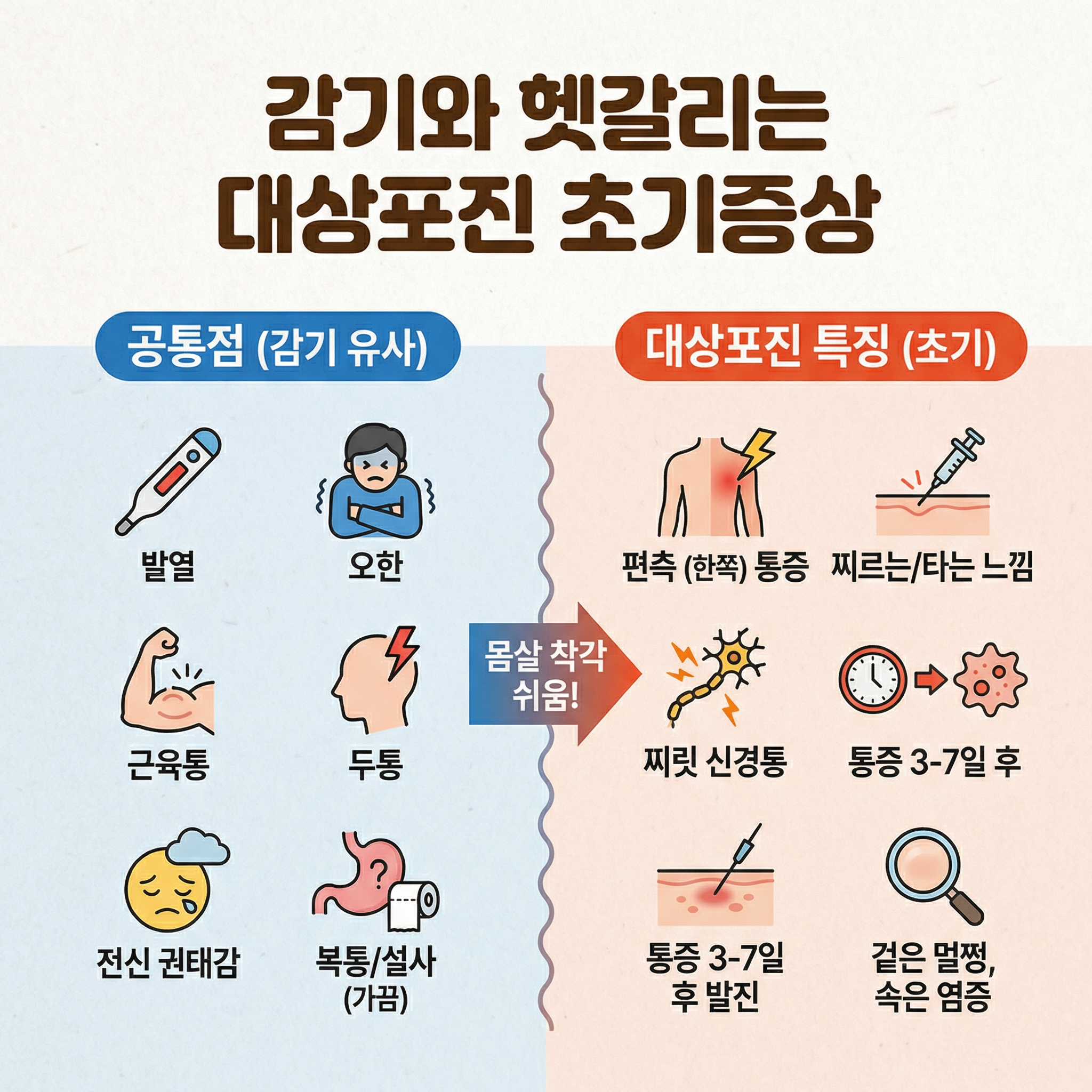 대상포진 초기증상은 감기와 비슷하지만 몸 한쪽에 나타나는 신경통이 중요한 신호예요. 대상포진 초기증상을 빠르게 알아차리고 72시간 이내 치료를 시작하는 것이 가장 중요해요. 특히 50대 이상이라면 대상포진 초기증상을 반드시 숙지하고 예방접종까지 고려하는 것이 좋아요.